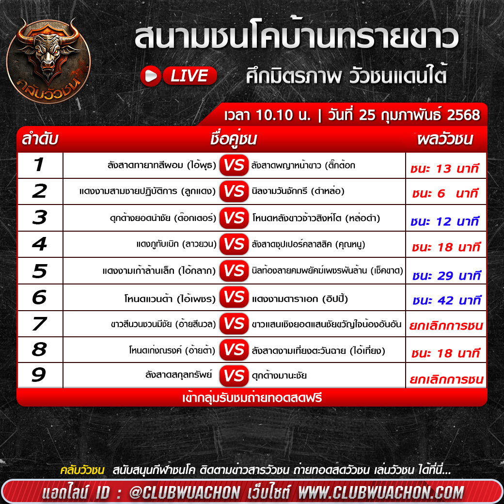 ผลวัวชน วันที่ 25 กุมภาพันธ์ 2568   สนามชนโคบ้านทรายขาว