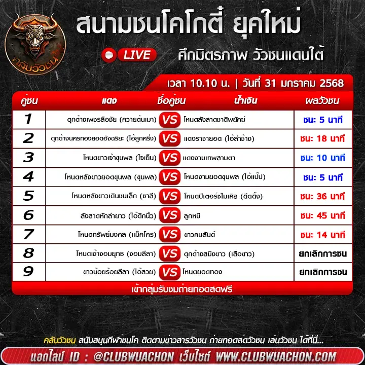 ผลวัวชน วันที่ 31 มกราคม 2568 สนามกีฬาชนโคโก๋ตี๋ ยุคใหม่