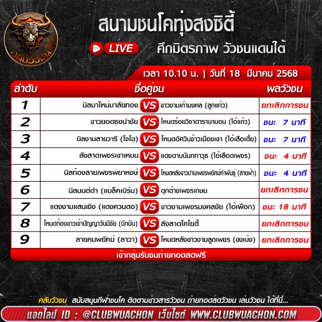 สรุปผลวัวชน 18 มีนาคม 2568 สนามชนโคทุ่งสงซิตี้