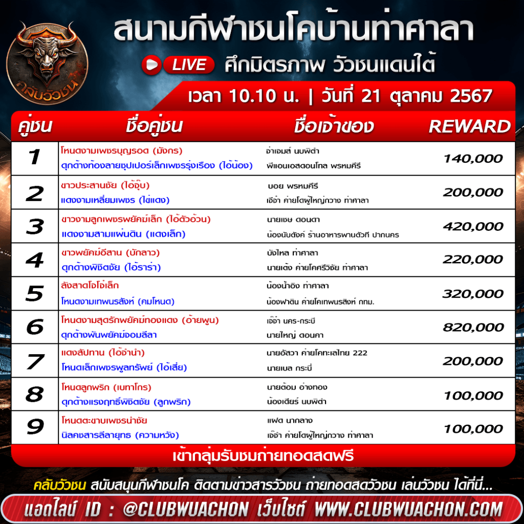 โปรแกรมวัวชนวันนี้ สนามกีฬาชนโคบ้านท่าศาลา วันที่ 21 ตุลาคม 2567 เริ่มชนเวลา 10:30 น.
