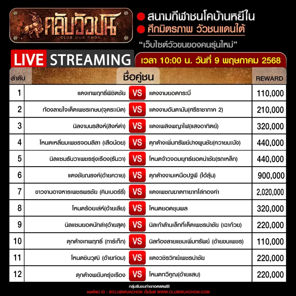โปรแกรมวัวชน วันที่ 9 พฤษภาคม 2568 สนามกีฬาชนโคบ้านหยีใน เริ่มเวลา 10:30 น.